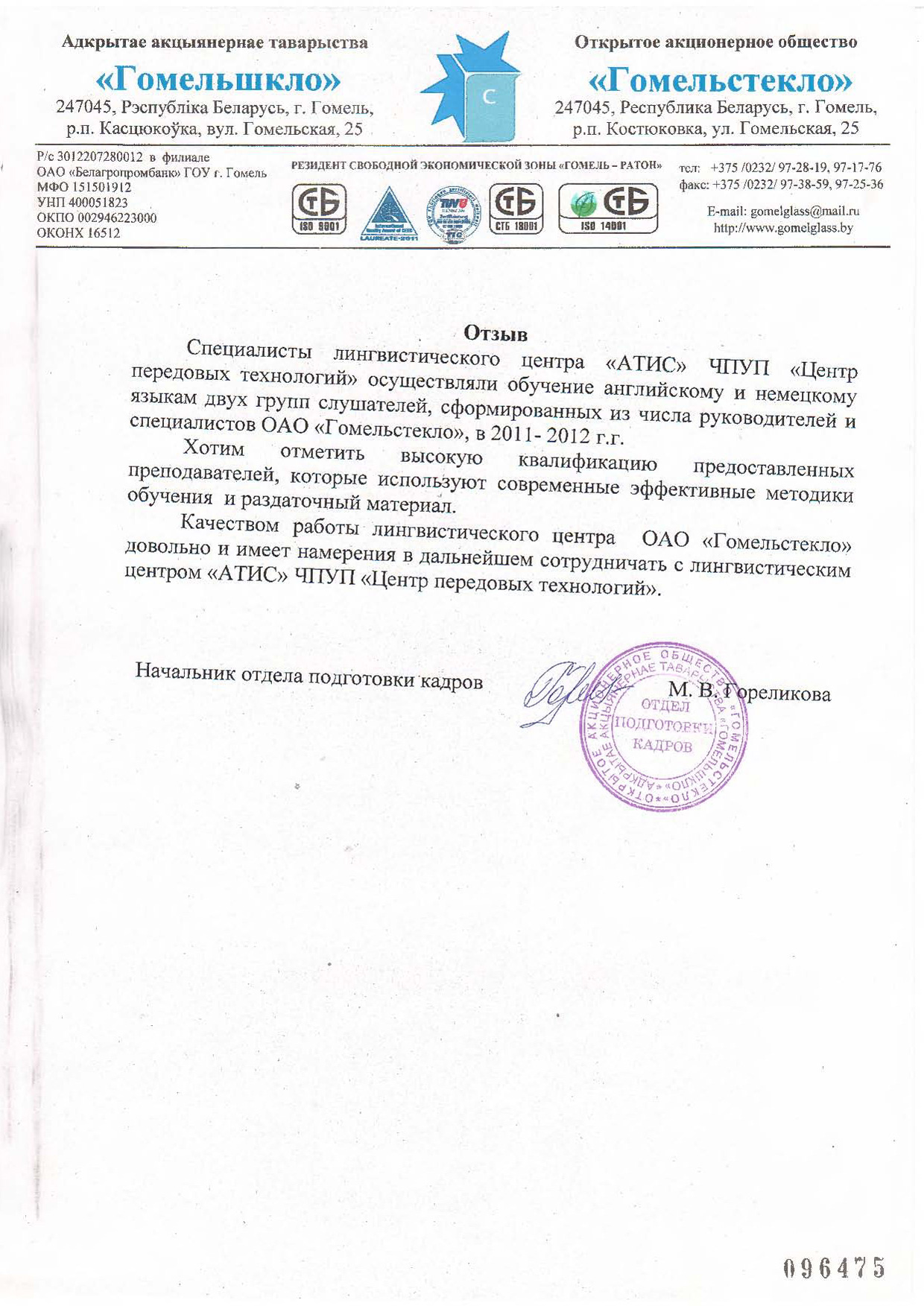 ОАО «Гомельстекло» и многочисленных клиентов частной формы собственности.